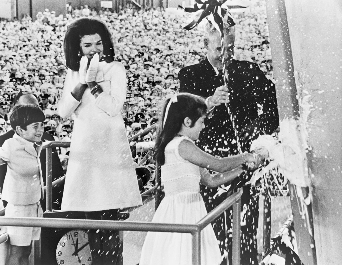 NNS christens John F. Kennedy (CV 67). A young Caroline Kennedy christened the ship – named for her late father – in front of a crowd of more than 32,000.