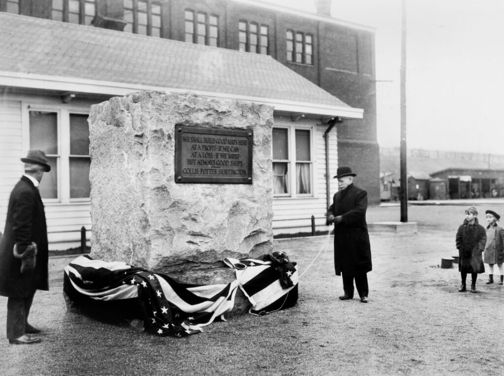 NNS unveils the Rock, a memorial to company founder Collis P. Huntington. The plaque on the monument features a quote attributed to Huntington: “We shall build good ships here; at a profit if we can, at a loss if we must, but always good ships.”