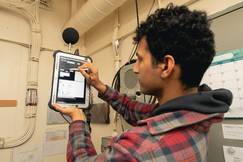 Engineers from across Newport News Shipbuilding remained busy during the John F. Kennedy (CVN 79) builder’s sea trials, but the Noise and Vibration Test Engineering (NVTE) team in particular faced a daunting task: record and test noise levels in approximately 2,000 spaces of the ship using their arsenal of Airborne Noise Tablets (ANTs).