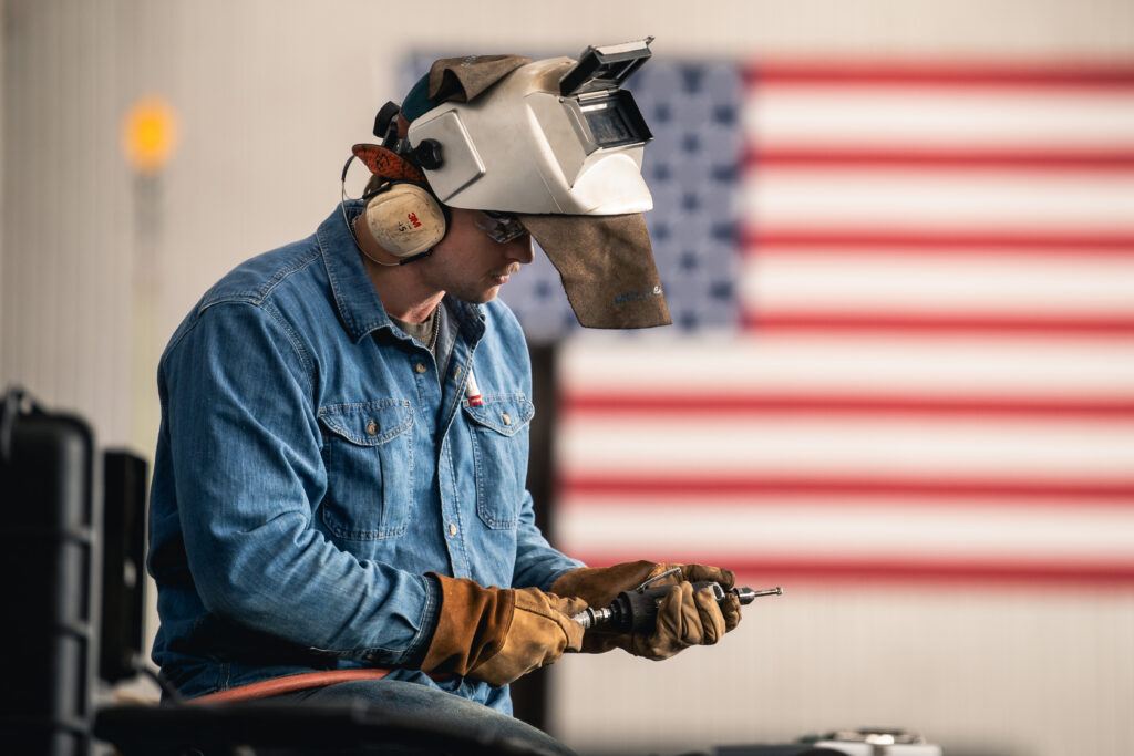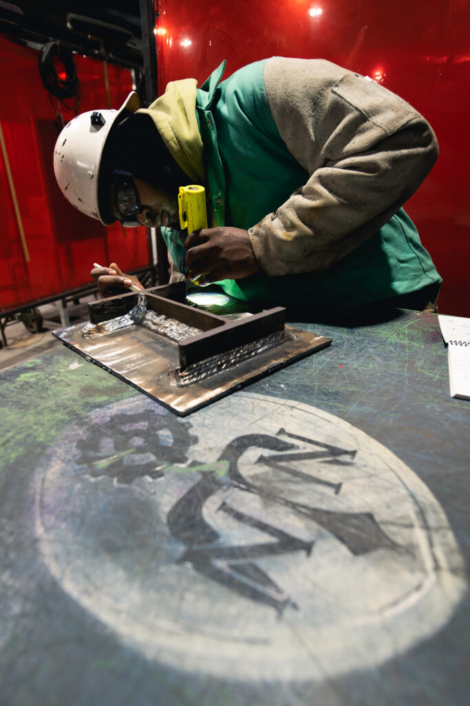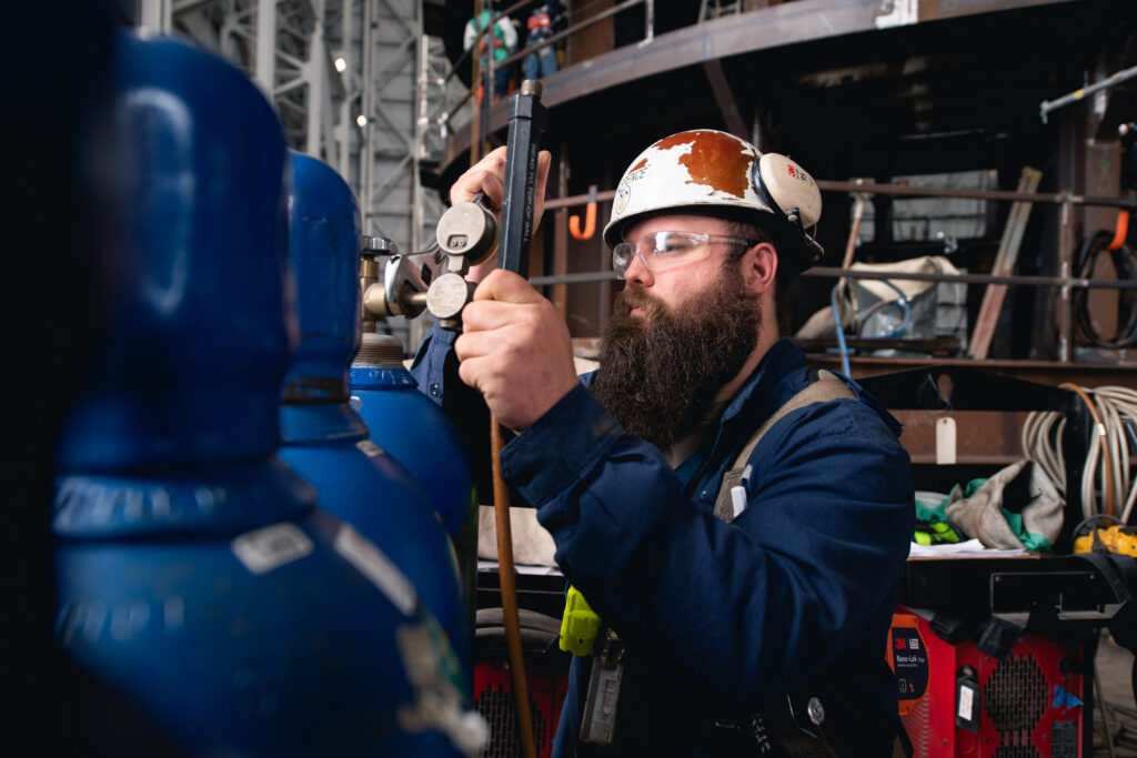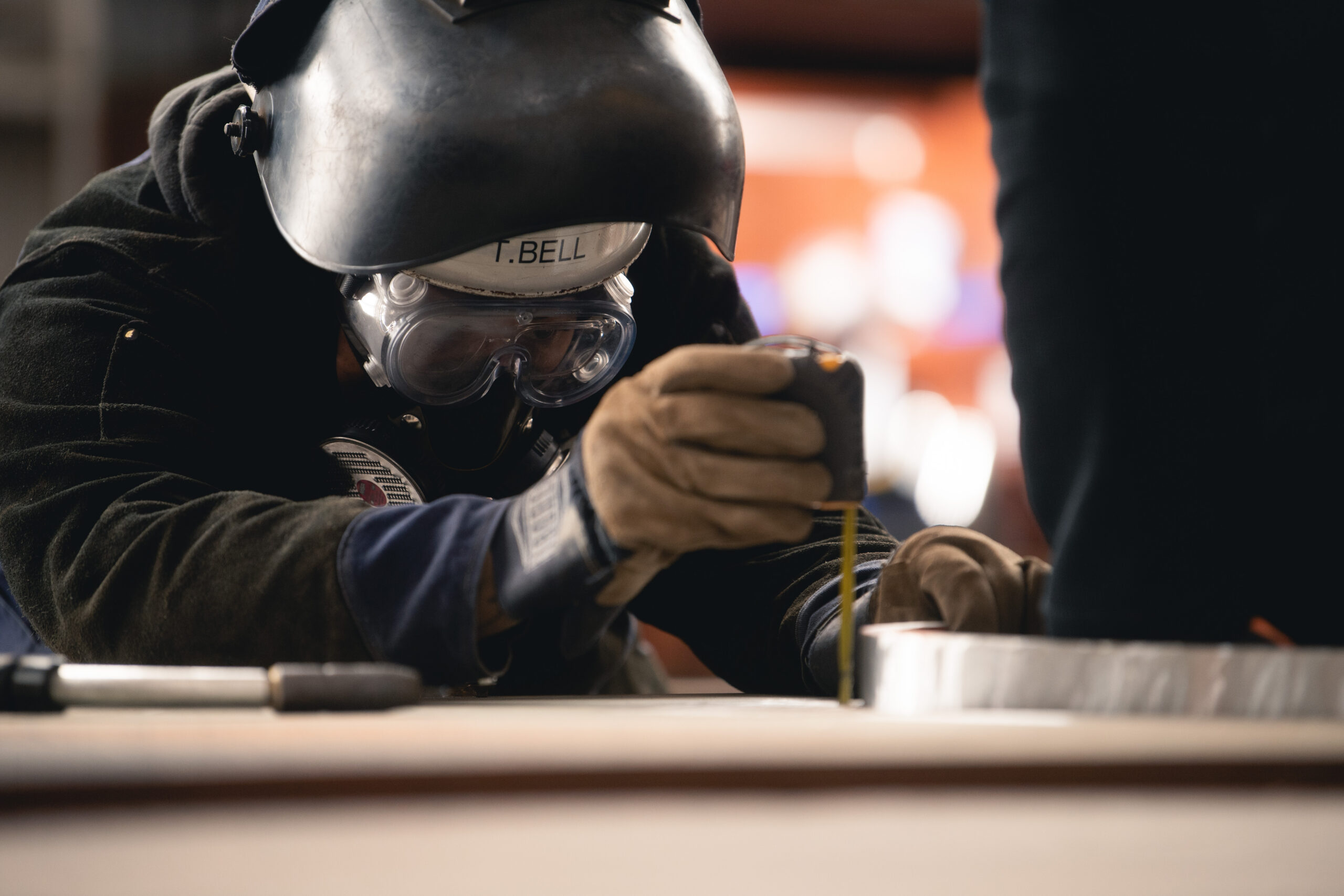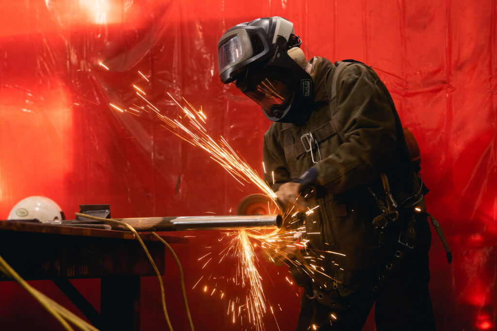 Rickie Manigault welds in an NNS Charleston Operations facility.