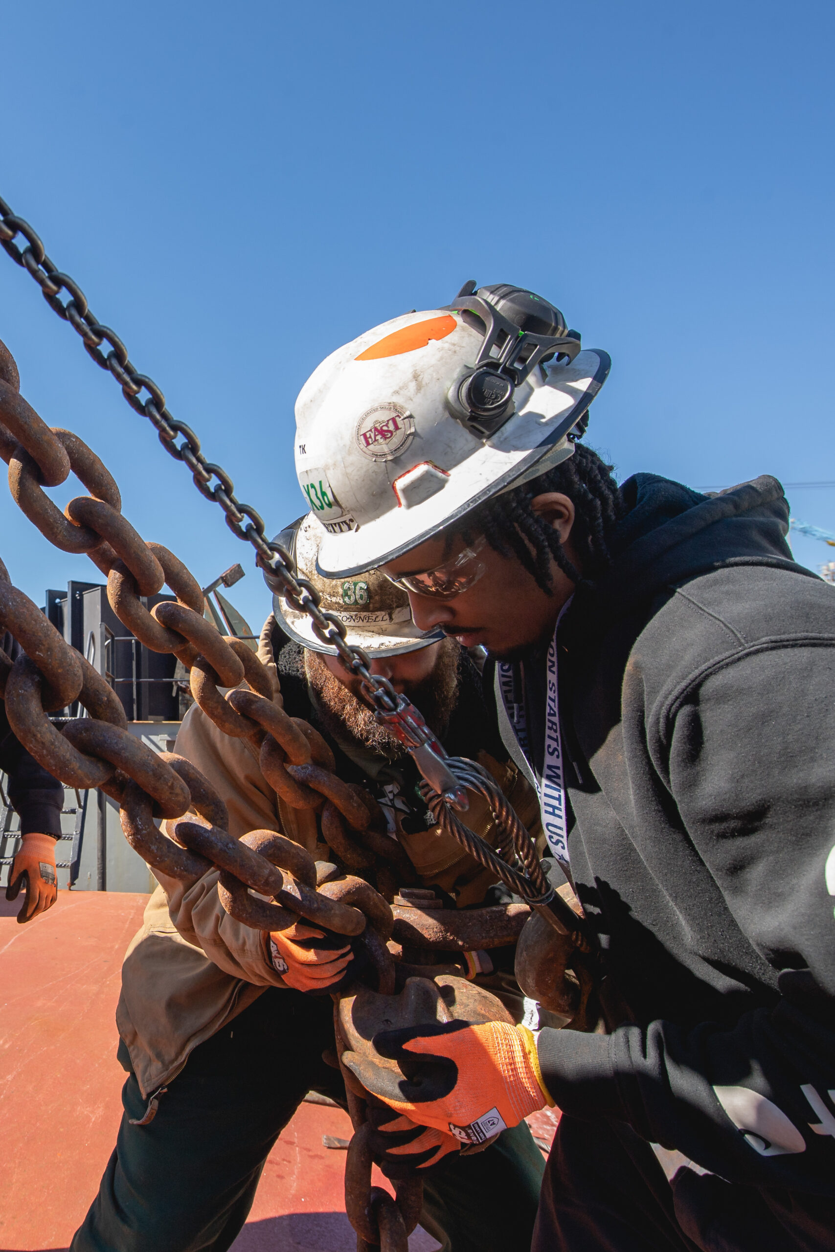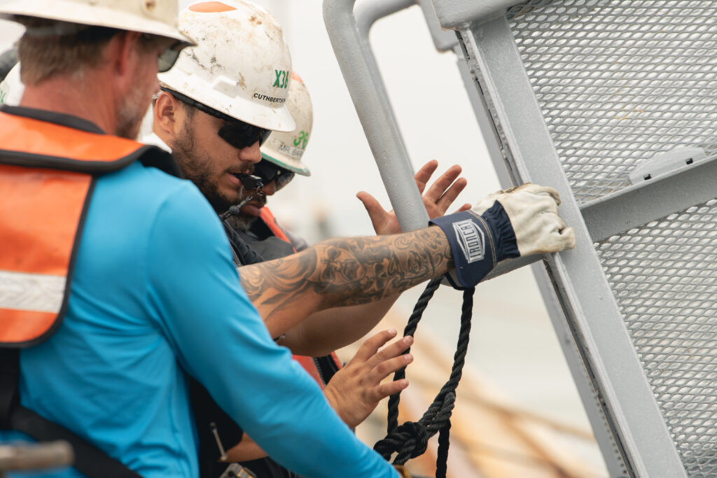 Takevion Petty and Cody Connell work together to secure a unit to a barge.