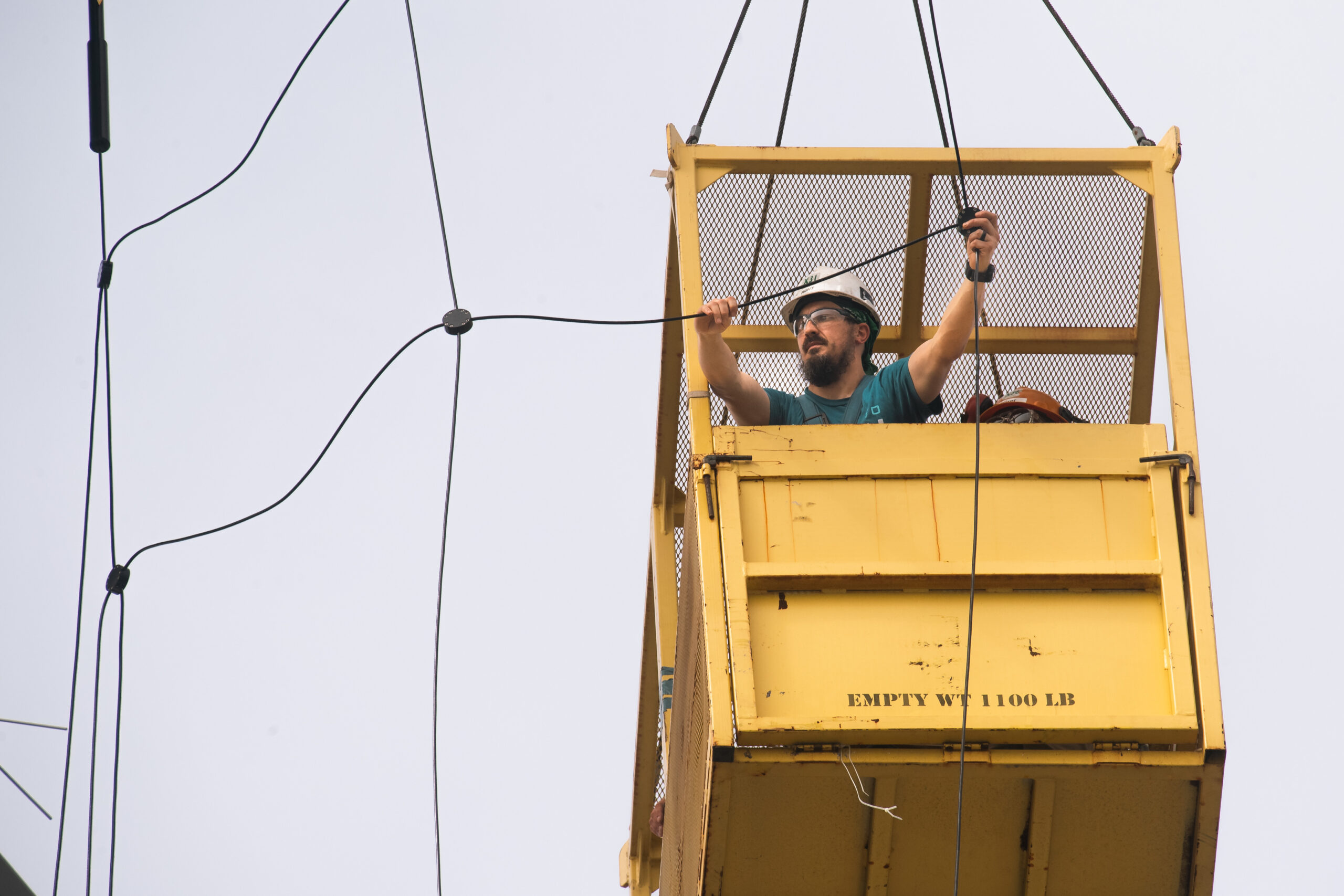 Micah Hunt installs a fan wire on the mast of John F. Kennedy (CVN 79).