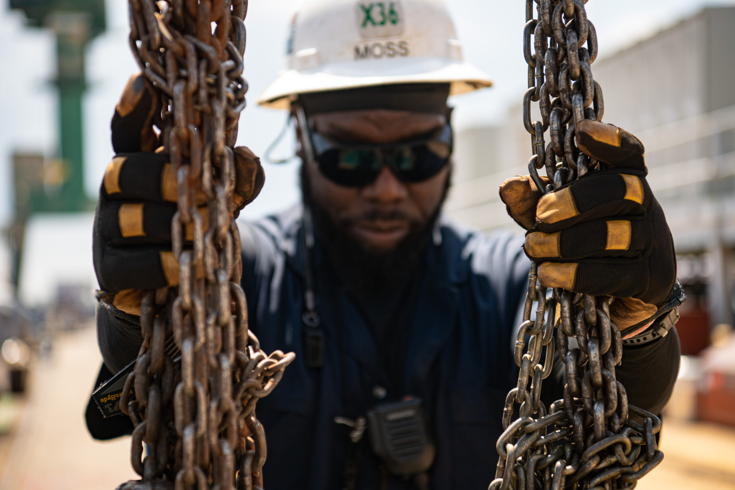 Eugene Moss lowers chains on to a pallet after use.