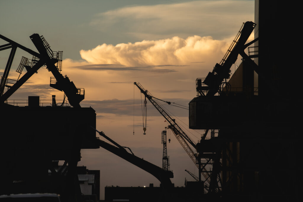 Morning light is seen through cranes at Newport News Shipbuilding.