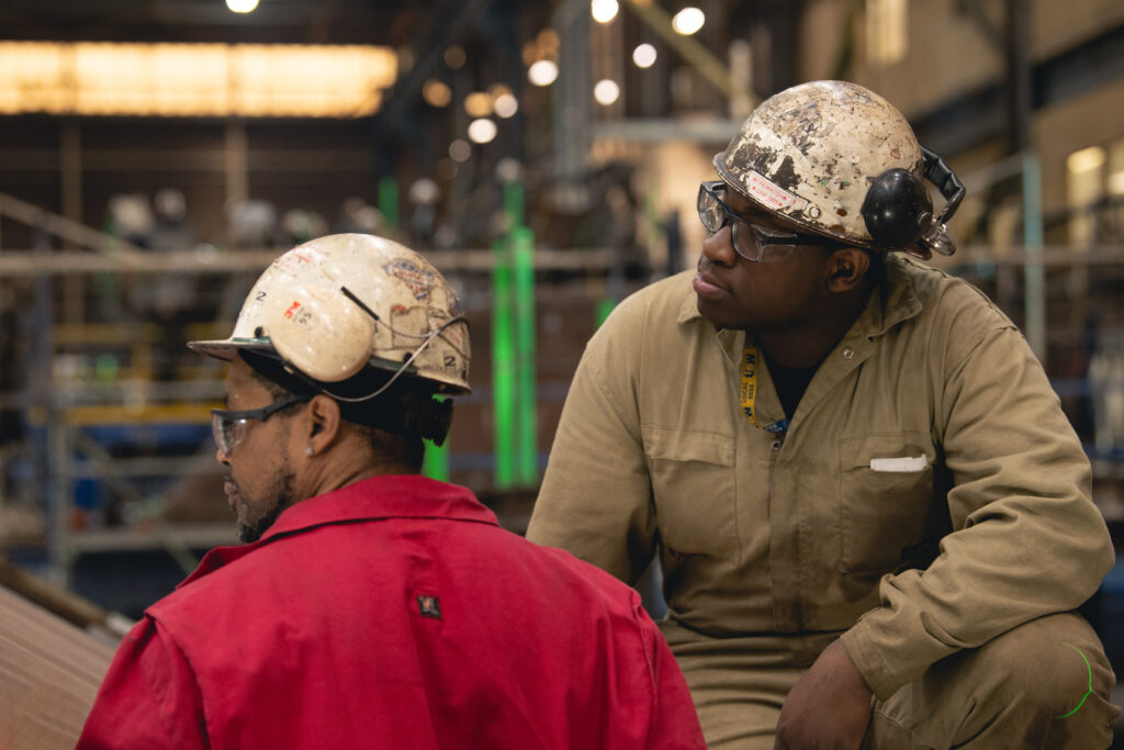 Jamul Brown and Dashon Ward work together to ensure two plates for a submarine unit align before welding them together.