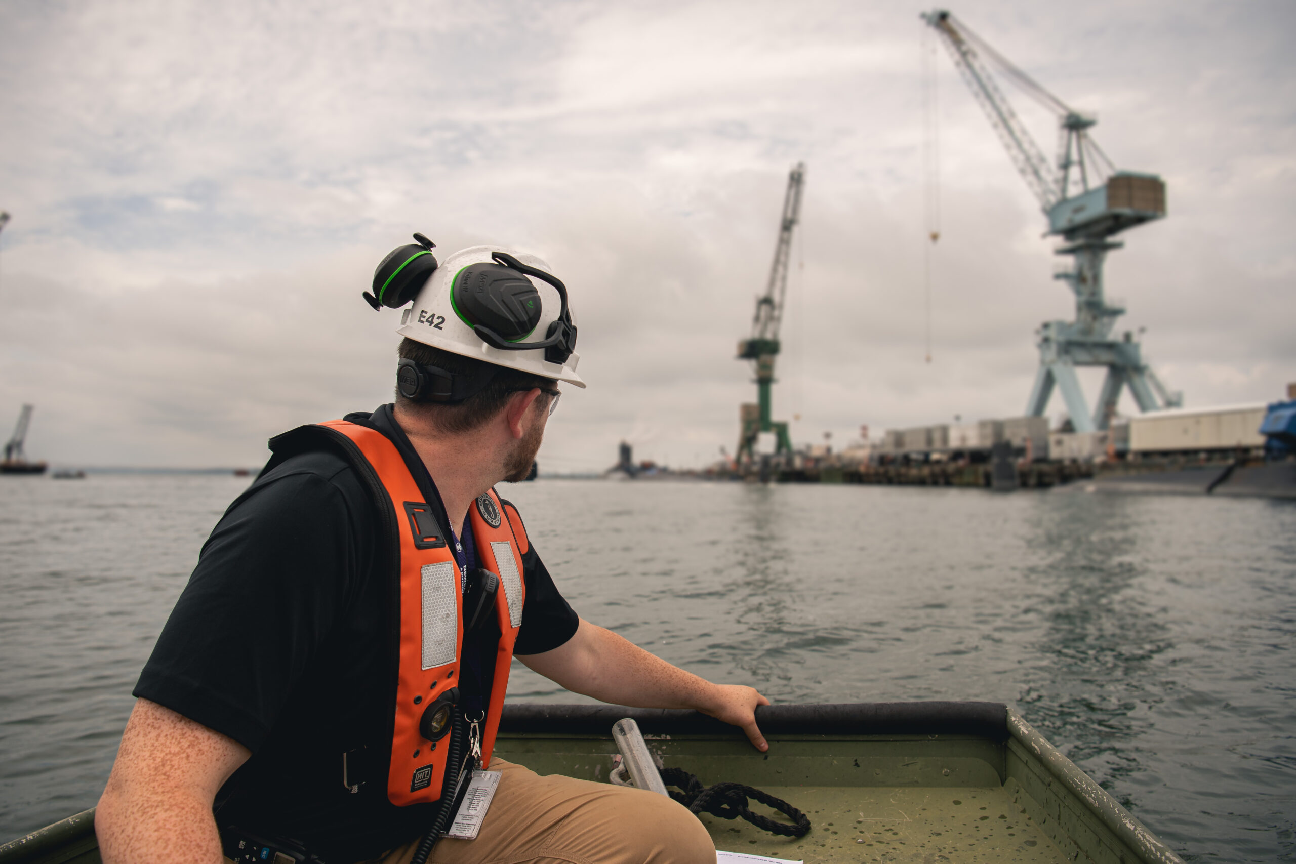 Angus Blakely looks toward Arkansas (SSN 800) prior to taking weight measurements of the Virginia-class submarine.
