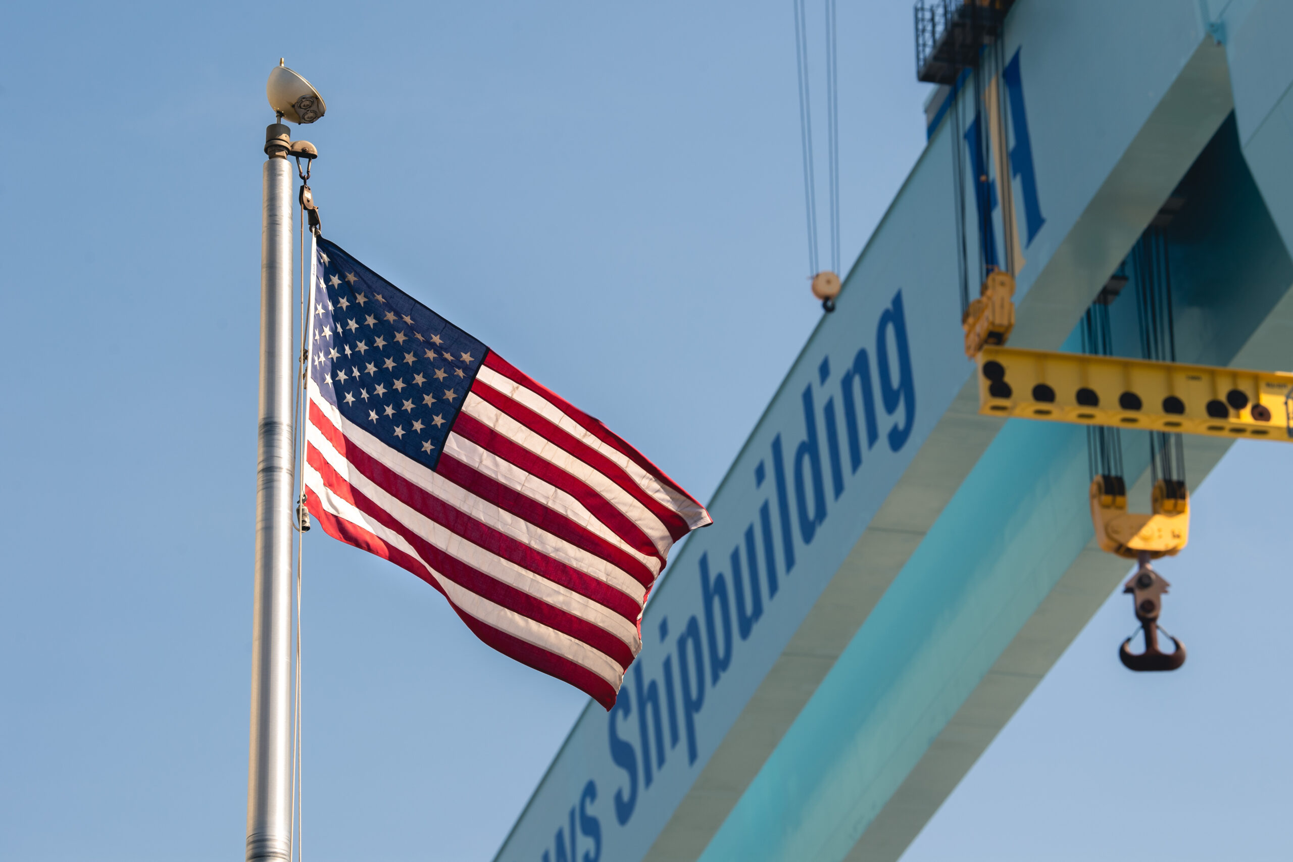 An American flag flies near Newport News Shipbuilding’s 315-ton goliath gantry crane.