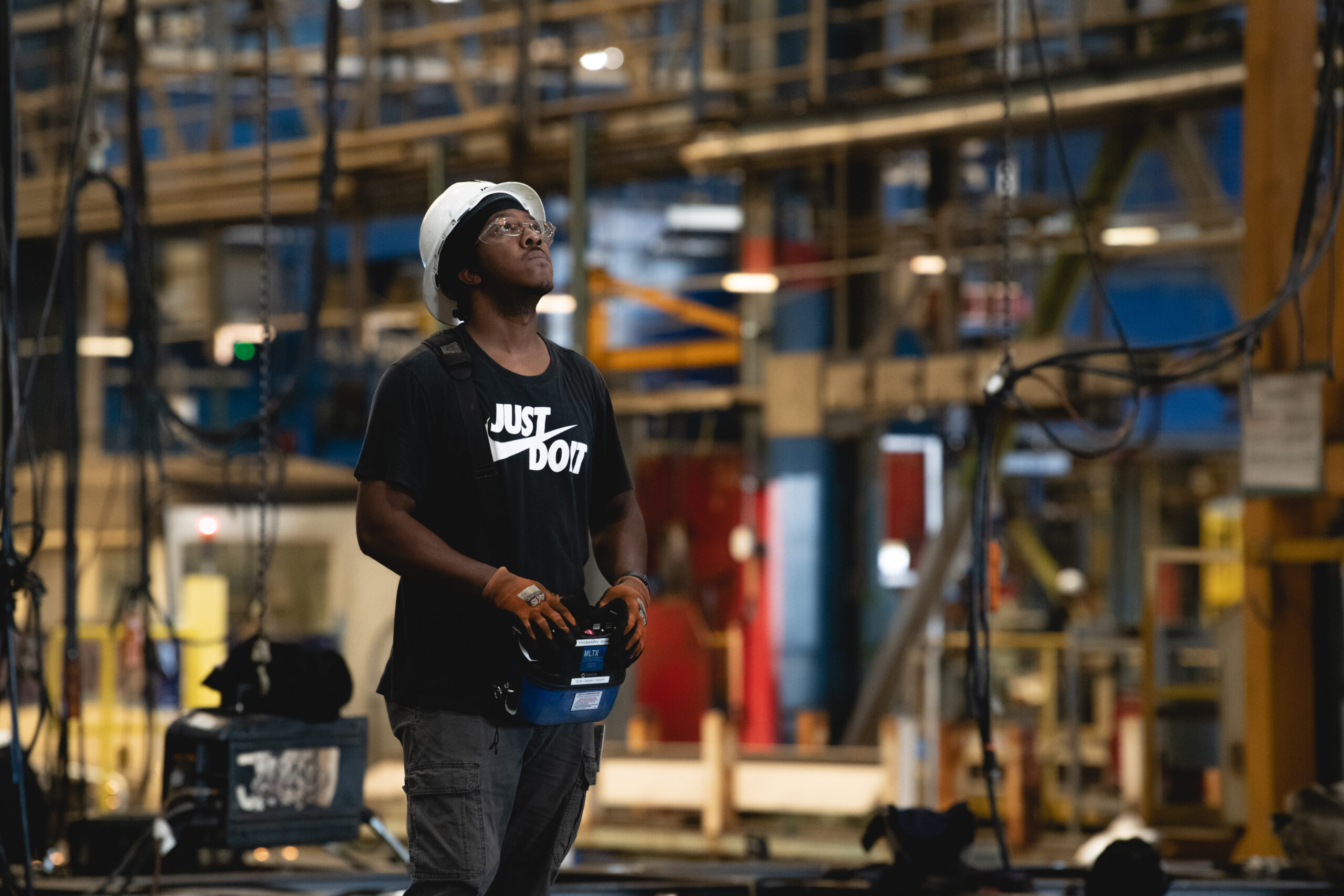 Roderick Johnston operates a crane in a shop.