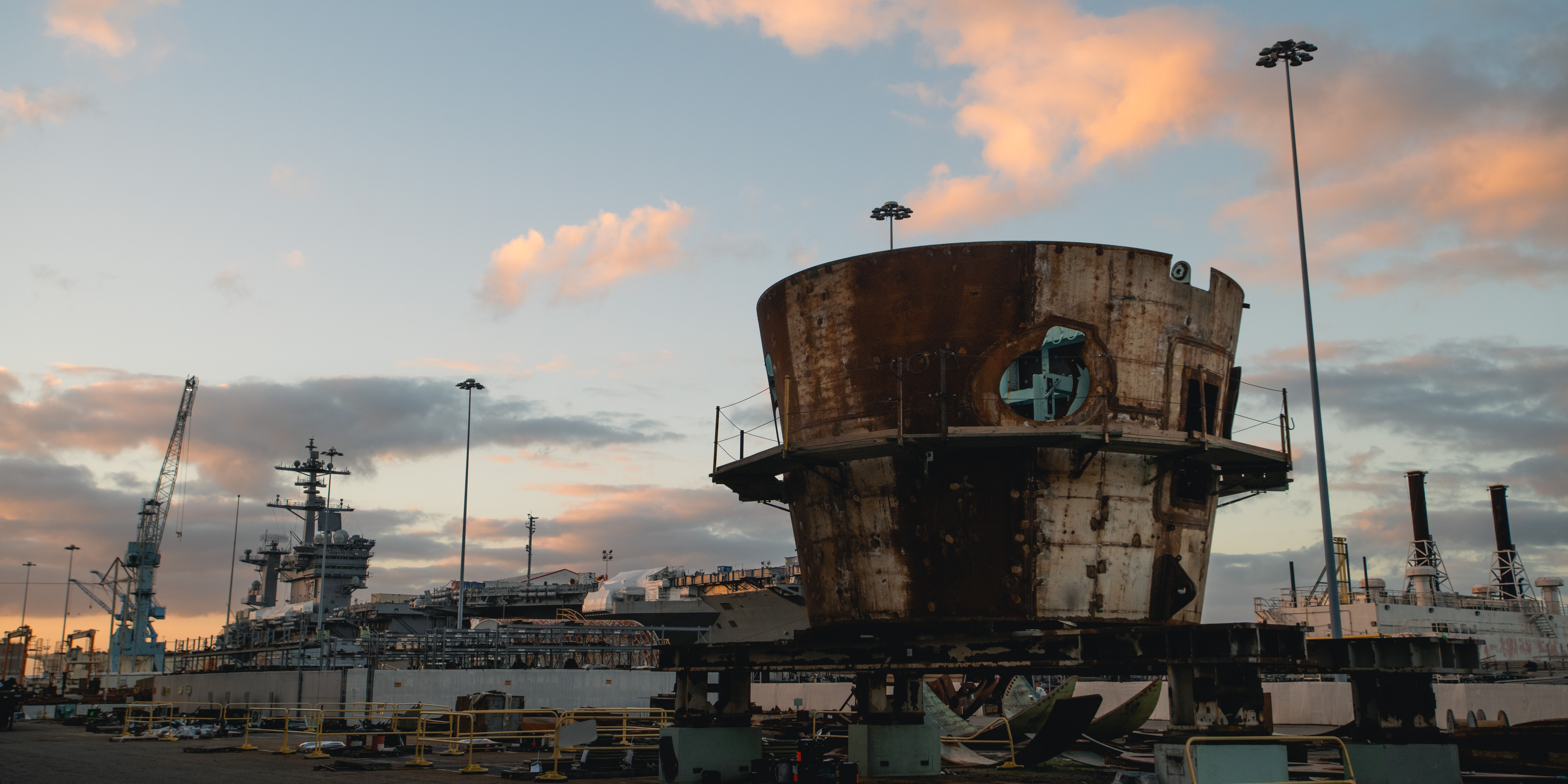 Newport News Shipbuilding’s 315-metric-ton crane is silhouetted during a sunset. Photo by Ashley Cowan