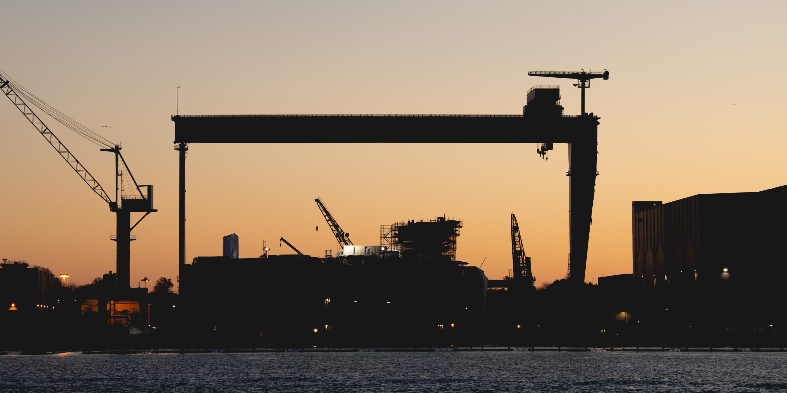 A silhouette of USS John C. Stennis (CVN 74) is seen as the sun rises over Newport News Shipbuilding. Photo by Lexi Whitehead