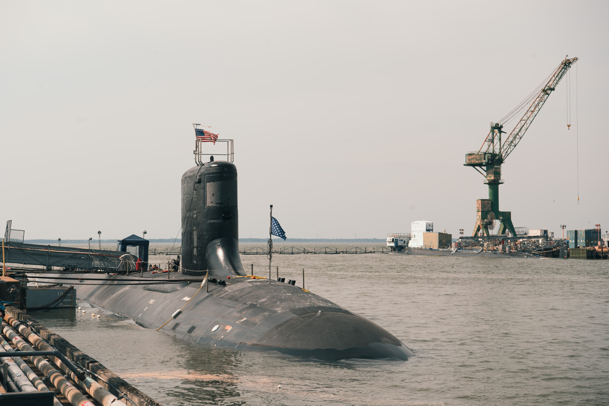 USS New Jersey (SSN 796) and Massachusetts (SSN 798) are seen across from each other while pier side at Newport News Shipbuilding.