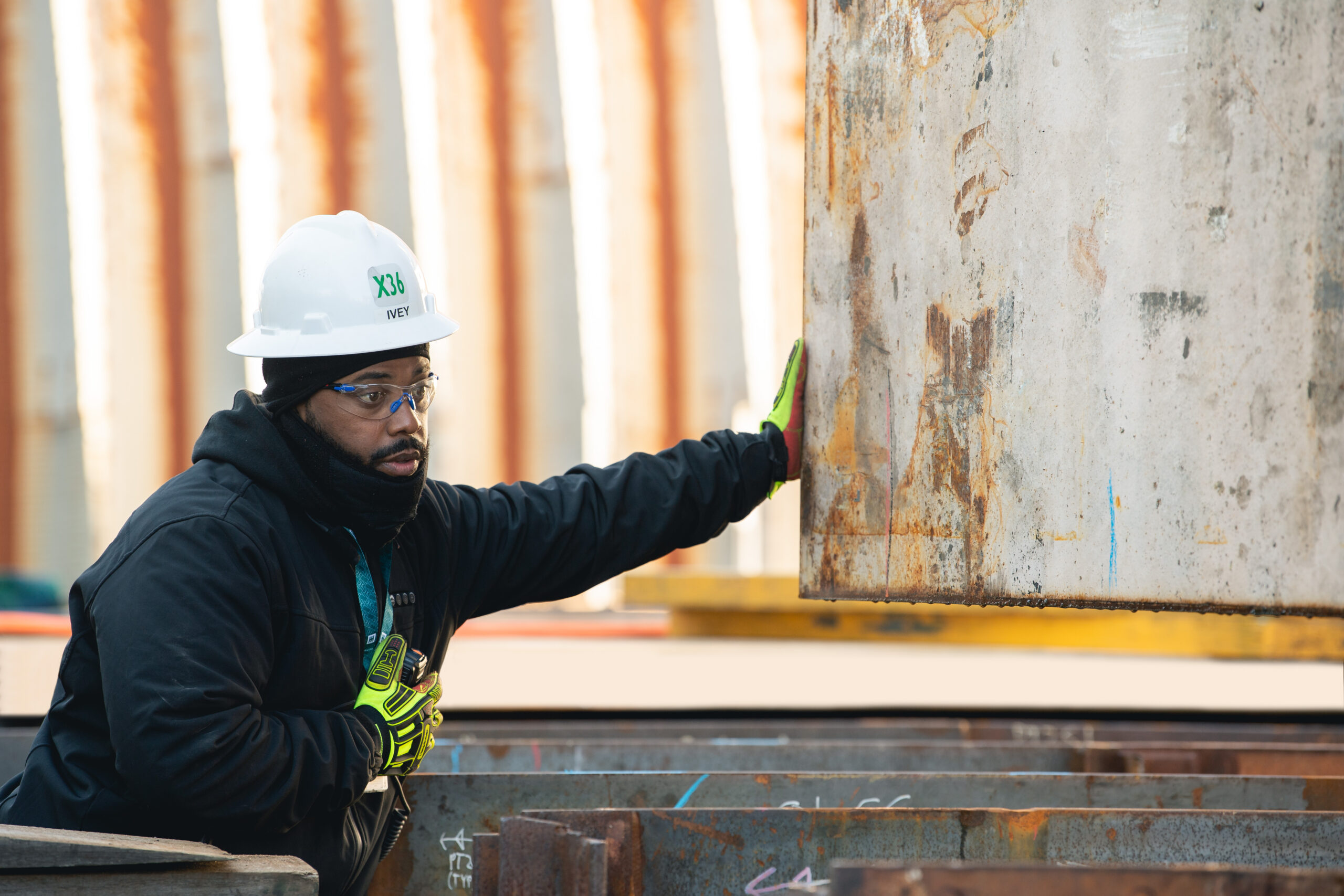 Jamar Ivey radios to the crane operator to lower a plate on to staging for further construction.