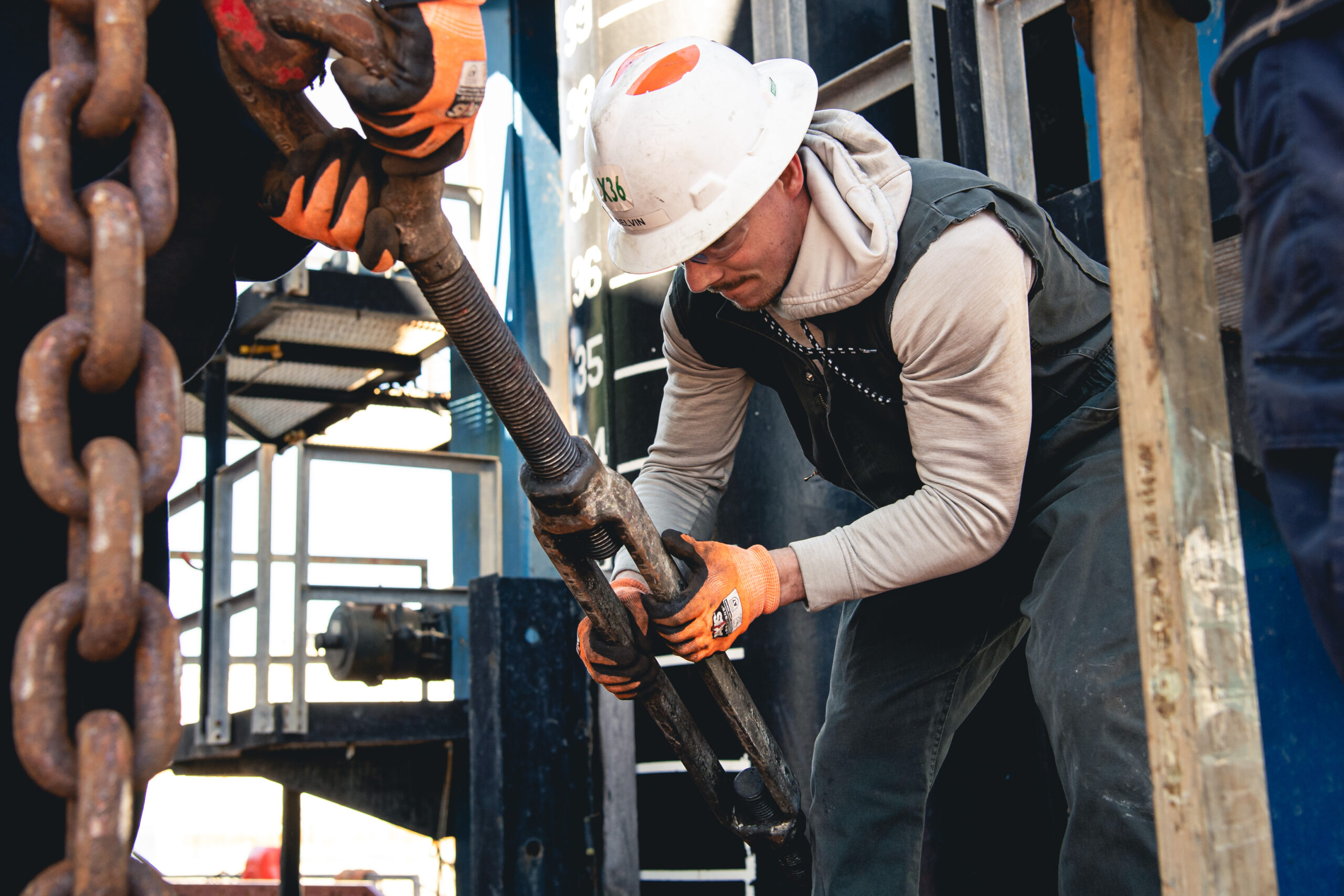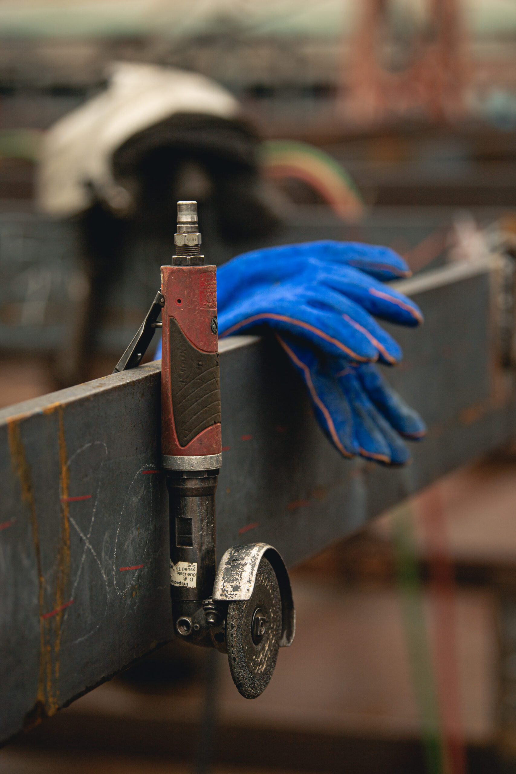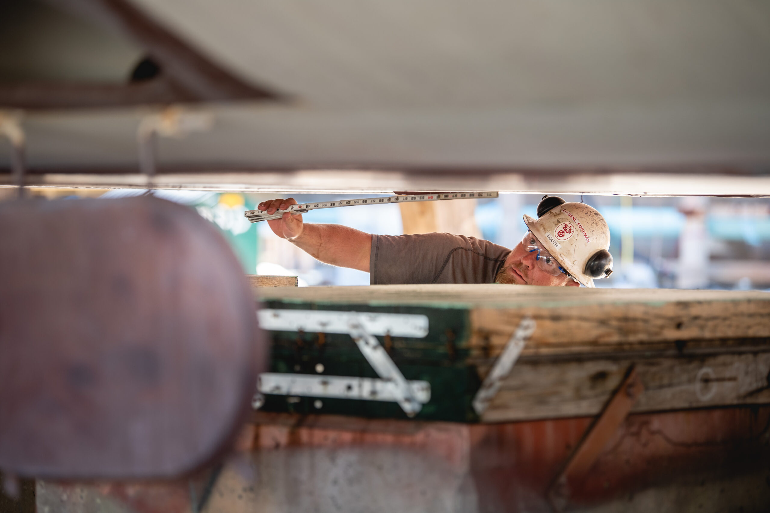 Shipbuilder Josh West prepares a spot to weld a support beam.