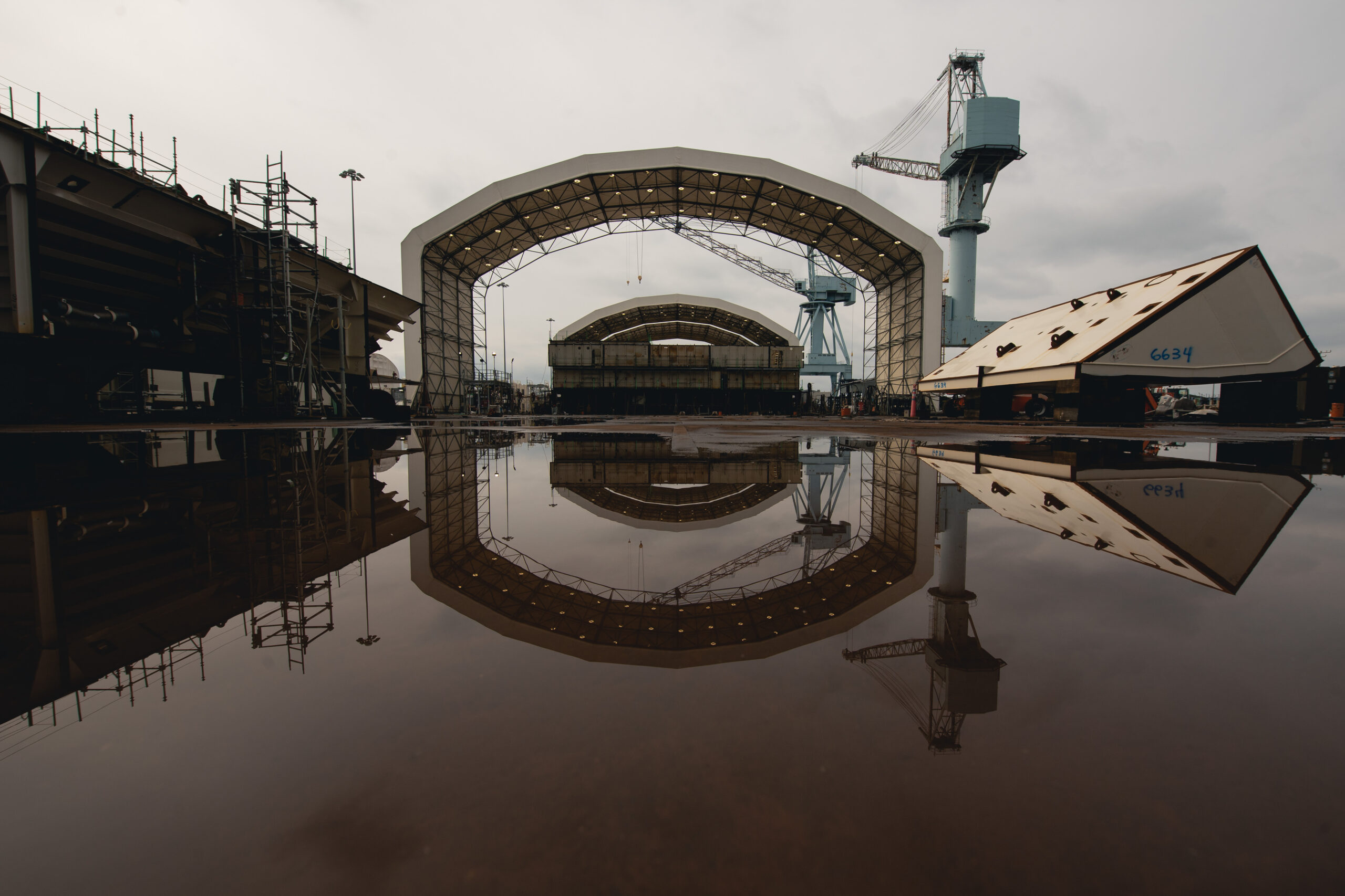 Aircraft carrier units are reflected in a puddle after a heavy rain on the platen.