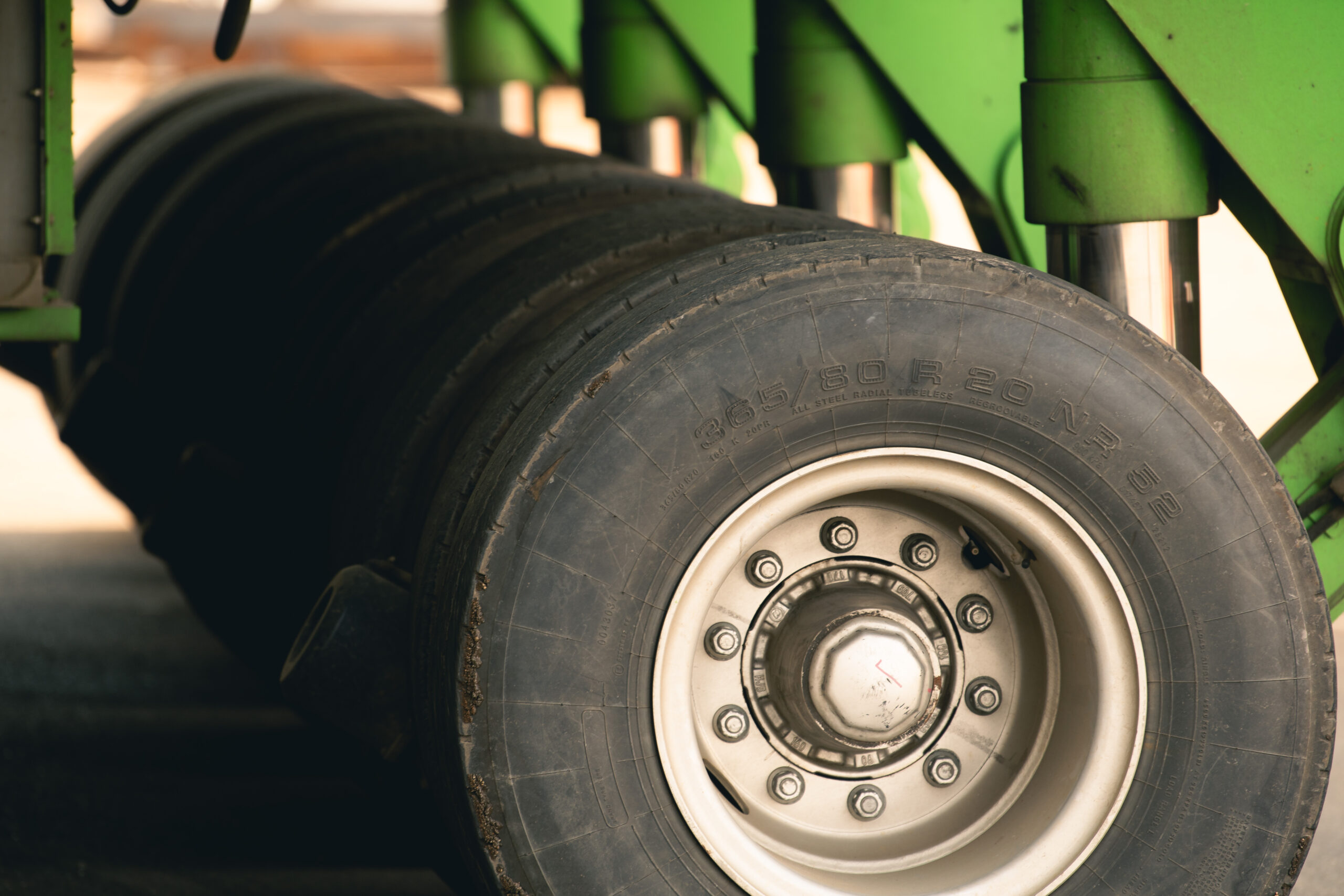 Tires on a transporter that carry large units around the yard are aligned.