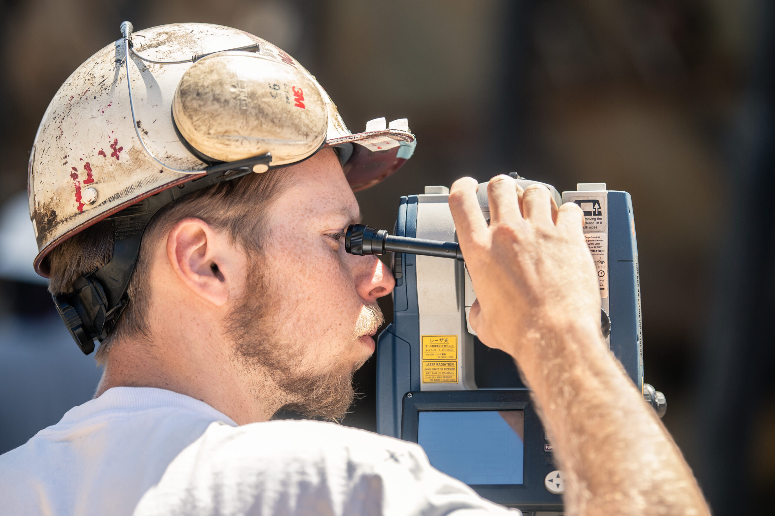 Joshua Stamp uses a transit tool to ensure optical alignment of an aircraft carrier unit.