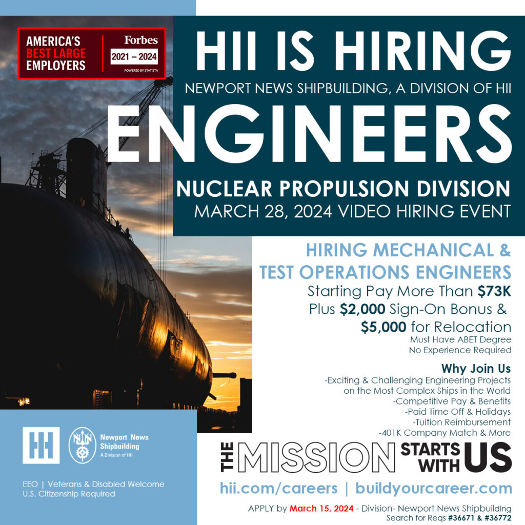 Newport News Shipbuilding Talent Acquisition is hosting an engineer hiring event on March 28. This event is for entry-level engineering opportunities in the Nuclear Propulsion Division. Qualified internal candidates who apply will be invited for an in-person interview. Qualified external candidates who apply will be invited for a video interview. The deadline to apply to be invited for an interview is March 15.