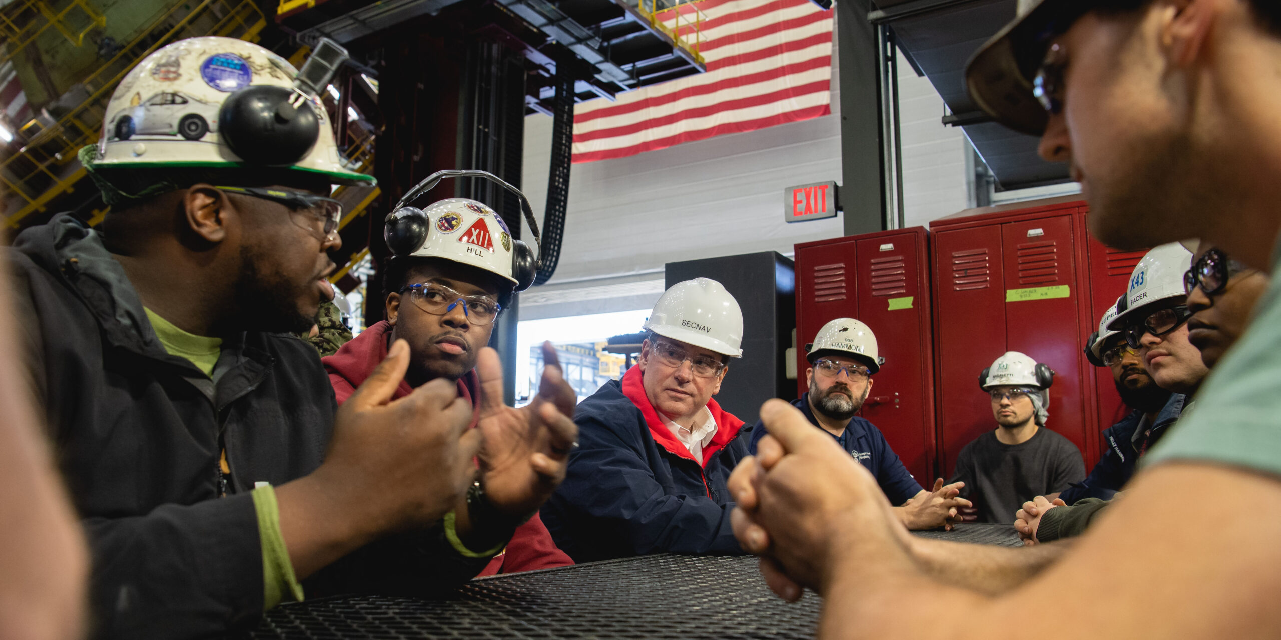 Secretary of the Navy John Phelan, center, talks with shipbuilders in the Joint Manufacturing Assembly Facility (JMAF). Photo by Ashley Cowan NNS Hosts Secretary of the Navy