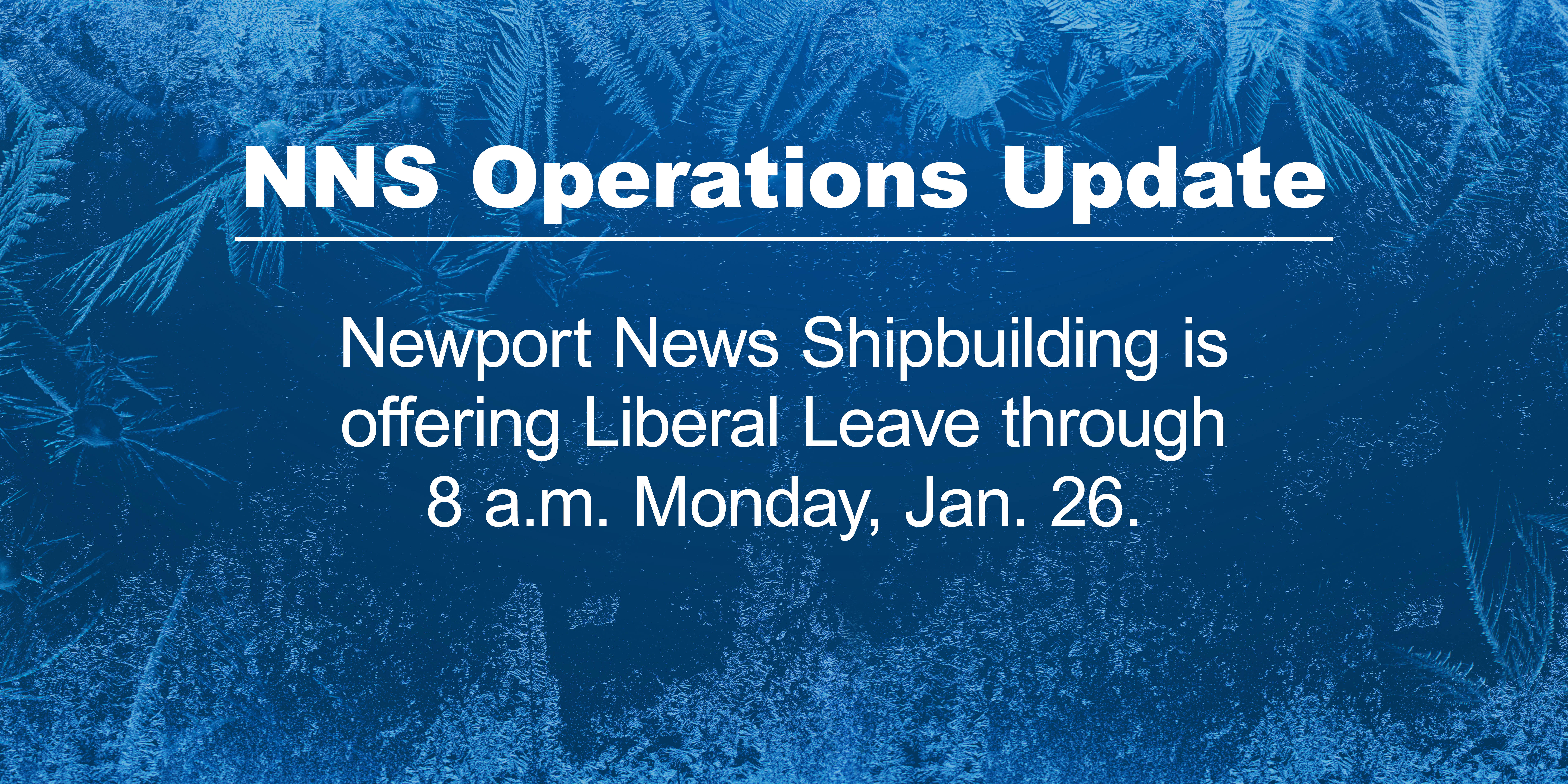 Newport News Shipbuilding will offer liberal leave starting with third shift tonight (Sunday, Jan. 25), through 8 a.m. on Monday, Jan. 26. This means that liberal leave will be offered for all of third shift and the beginning of first shift on Monday. First shift shipbuilders can report at their normal start time or take liberal leave through 8 a.m. – however, all shipbuilders on first shift are expected to report to work by 8 a.m. on Monday unless they receive different instructions from their supervisor.