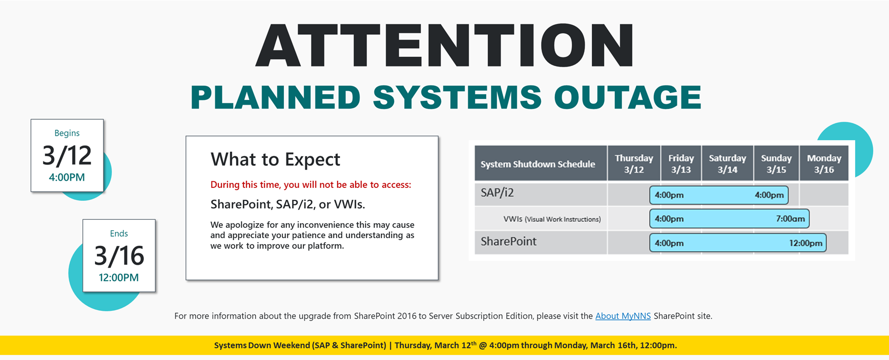As SharePoint 2016 has reached its end-of-life, we will be migrating to the Server Subscription Edition on March 12 at 4 p.m. This upgrade is necessary to support the system shutdown and transition to the new platform. During the upgrade process, SharePoint will be unavailable. We apologize for any inconvenience this may cause and appreciate your patience and understanding as we work to improve our platform. .