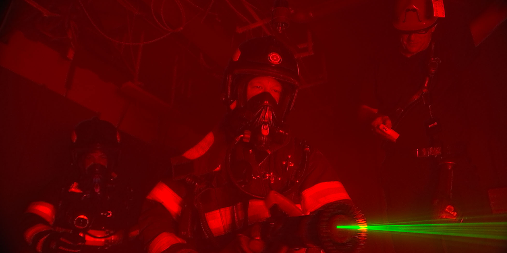 He walked participants through the space on the ship used for the training exercises with the lights on and with clear visibility before turning the lights out and filling the air with simulated smoke. Firefighters used a weighted hose to simulate a pressurized line. The nozzles shot lasers at a fire on an LED screen. Weighted dummies also were used to train for rescues.